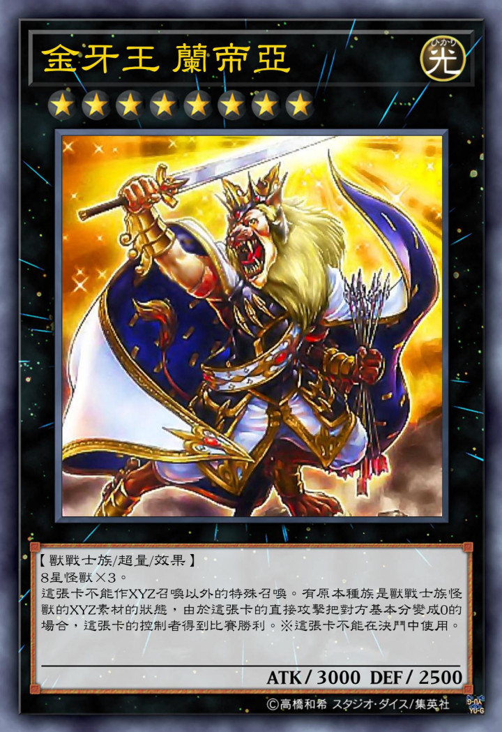 狮头人身的兽战士族怪兽,与传说的白龙有着一样的攻击力跟防御力,需要有兽战士族怪兽为超量素材的情况下,才能触发直接攻击让对方生命值归零,直接获取比赛胜利的能力。