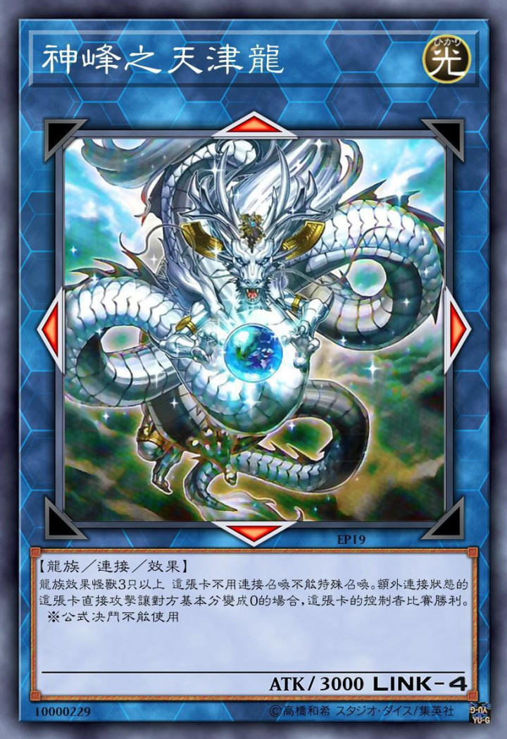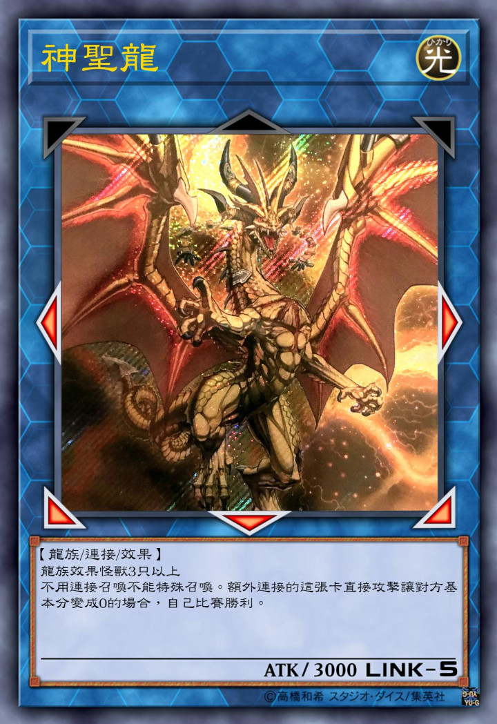跟神峰之天津龙一个路子的怪兽,效果方面几乎一样,攻击力也都是3000点的数值,不过连接等级方面神圣龙还是要比神峰之天津龙高一阶的。