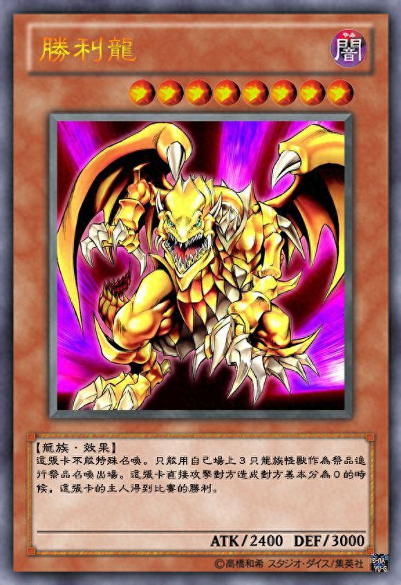 就拿胜利龙来说吧,这只怪兽需要场上三只龙族怪兽为祭品进行召唤,而它直接攻击造成对方生命值归零的时候,胜利龙的控制着获取本次比赛的胜利。