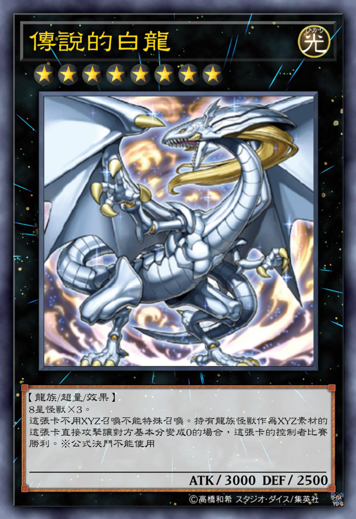 传说的白龙,与青眼白龙一样的攻击力跟防御力,由三只8星怪兽为超量素材召唤而来,需要由龙族怪兽作为超量素材的情况下,直接攻击对方玩家,让他生命值归零,就能获取比赛的直接胜利。